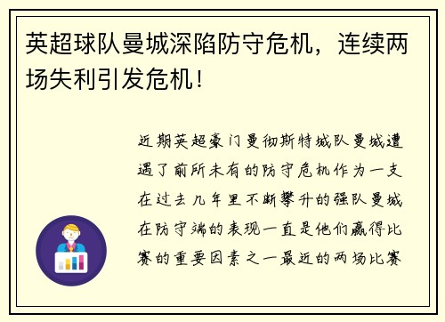 英超球队曼城深陷防守危机,连续两场失利引发危机!