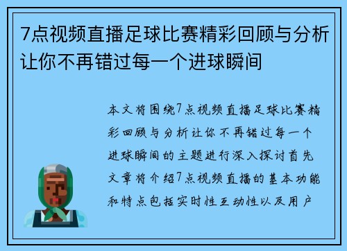 7点视频直播足球比赛精彩回顾与分析让你不再错过每一个进球瞬间