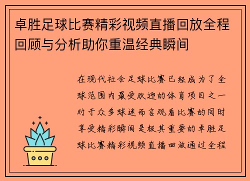 卓胜足球比赛精彩视频直播回放全程回顾与分析助你重温经典瞬间